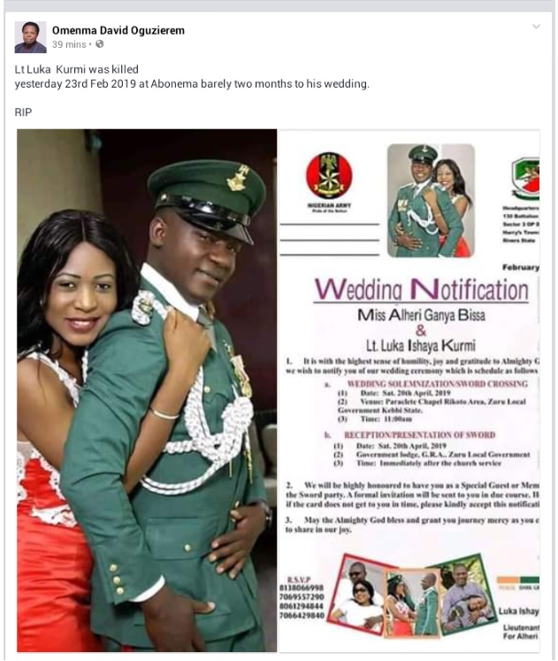 The late officer was set to wed a lady identified as Alheri Ganya Bissa on Saturday, April 20th in Kebbi State.