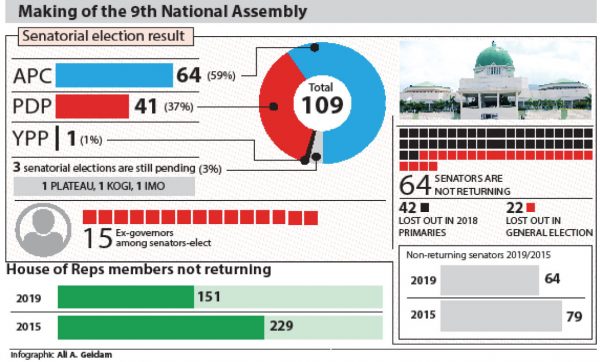 As APC forms majority in Senate, House No fewer than 64 serving senators and 151 members of the House of Representatives will not be in the 9th National Assembly in June when it will be inaugurated, according to findings. Only 45 senators and about 209 members are returning to the federal legislature,…