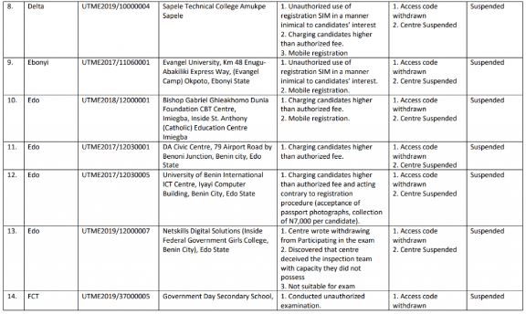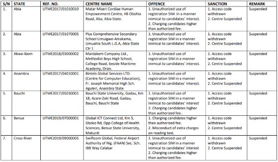 The Joint Admissions and Matriculation Board (JAMB) has released a list of suspended computer-based test (CBT) centres following the release of the 2019 UTME results.