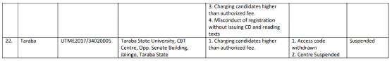 JAMB has now published the list of 22 CBT centres across the country with Edo, Ekiti, Abia and Nasarawa having the highest number of suspended centres, as published on the JAMB official website.