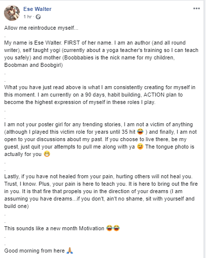 In a post she shared on her Facebook page this moring, Ese asked everyone to leave her out of the scandal. According to her, she played the victim role until she turned 35. Read what she wrote below
