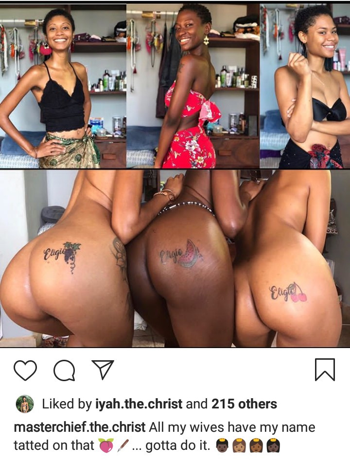 The African American cult leader shared the photos of his three wives’ backside and wrote: “All my wives get my name tatted on that ??… gotta do it.”