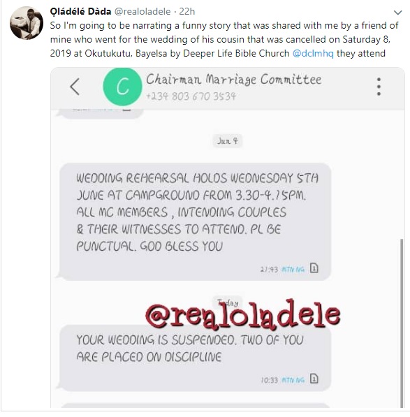 According to Oladele Dada, who shared the story on Twitter along with a screenshot of the message sent by the church to the couple, the Deeper Life State Overseer for Bayelsa state was the one who called the chairman of the marriage committee of the church and asked them to suspend the wedding.