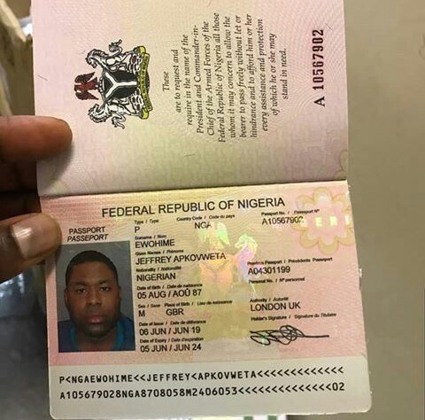 Jeffrey Apkovweta Ewohime’s passport. He has been arrested by police in London