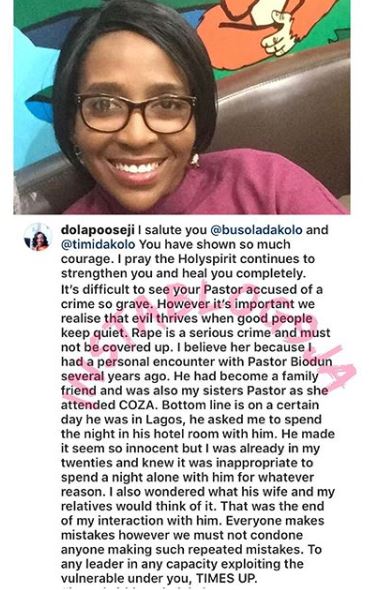 This lady named Dolapo Oseji explained the former cultist-turned Christian cleric invited her to his hotel room in Lagos while she was in her tweenties but she was smart enough to turn down his request.