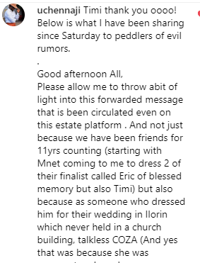 Celebrity stylist, Uche Nnaji who styled Timi during his wedding took the his comment section to corroborate with Timi’s claim. He had this to say: