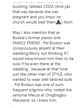 Good afternoon All,Please allow me to throw abit of light into this forwarded message that is been circulated even on this estate platform . And not just because we have been friends for 11yrs counting (starting with Mnet coming to me to dress 2 of their finalist called Eric of blessed memory but also Timi) but also because as someone who dressed him for their wedding in Ilorin which never held in a church building, talkless COZA (And yes that was because she was pregnant and you knpw no church would wed them🙏🏿) Ilorin .May I also mention that as Busola’s former pastor and FAMILY FRIEND , Pst Biodun was conspicuously absent at their wedding.Worry not thinking if I would have known him then to be sure if he even there at the wedding , because at that time just like other men of STYLE. who wanted to wear well tailored suits , Pst Biodun was one of such frequent pilgrims who visited the sartorial Mecca at Onigbogbo-Maryland. so I knew him.