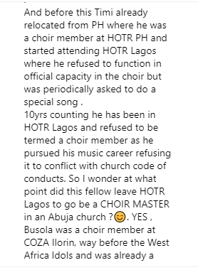 And before this Timi already relocated from PH where he was a choir member at HOTR PH and started attending HOTR Lagos where he refused to function in official capacity in the choir but was periodically asked to do a special song .10yrs counting he has been in HOTR Lagos and refused to be termed a choir member as he pursued his music career refusing it to conflict with church code of conducts. So I wonder at what point did this fellow leave HOTR Lagos to go be a CHOIR MASTER in an Abuja church ?😊. YES , Busola was a choir member at COZA Ilorin, way before the West Africa Idols and was already a staff of Zenith Bank at Ajose Adeogun Victoria Island LAGOS where her female colleagues used to mock her for dating a Blue Picanto driving singer.