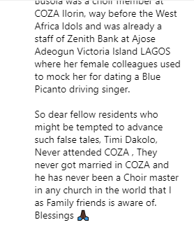 So dear fellow residents who might be tempted to advance such false tales, Timi Dakolo, Never attended COZA , They never got married in COZA and he has never been a Choir master in any church in the world that I as Family friends is aware of.