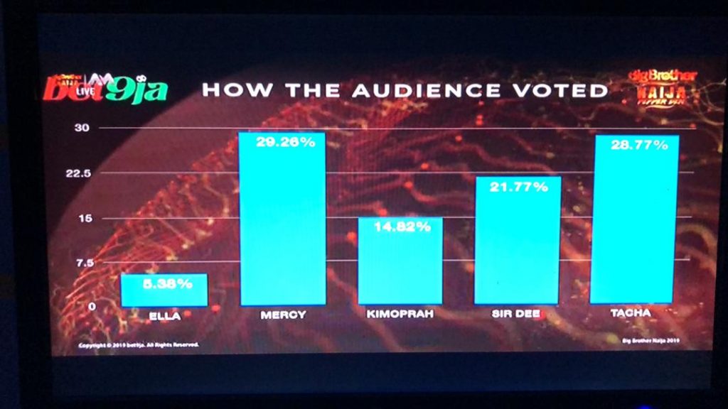On Sunday, July 7, 2019, two housemates, Isilomo and Avala were evicted from the Big Brother House emerging two of the housemates with the lowest amount of Bet9ja coins.