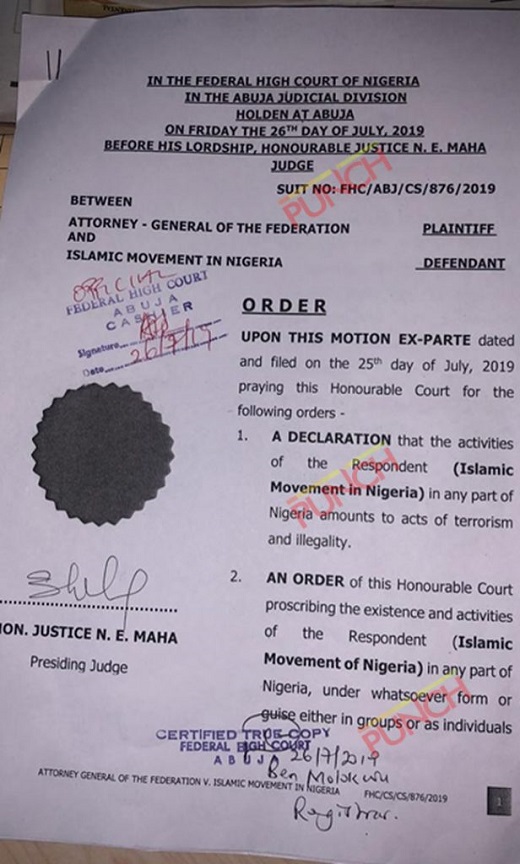 Saturday PUNCH reports that Justice Nkeonye Maha issued the order in a ruling in which she also designated the activities of the Shiite organisation in any part of Nigeria “as acts of terrorism and illegality.”