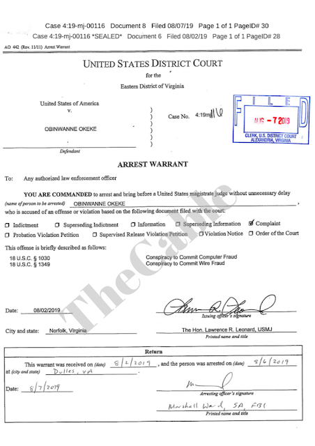 According to information obtained from the US federal court in Virginia, US, Okeke was scheduled to return to Nigeria four day after a complaint was filed against him at the court, and was arrested at the airport, just before he got on the flight to Nigeria.