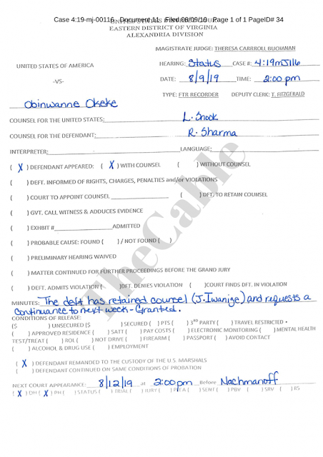 Okeke, who requested to for substitution of legal counsel is now being represented by John O. Iweanoge, II and THE IWEANOGES FIRM. The Iweanoges took over from Rahul Sharma, a US federal public defender.
