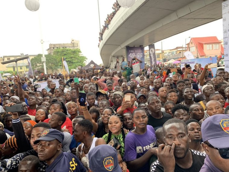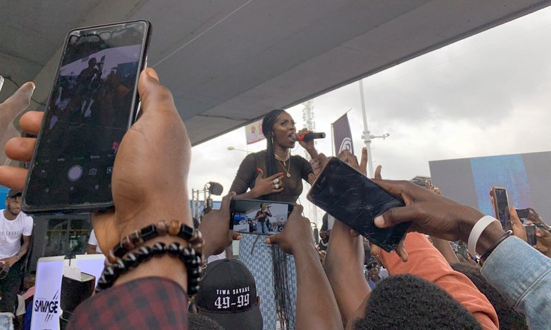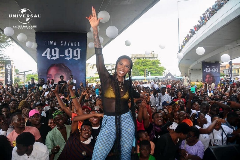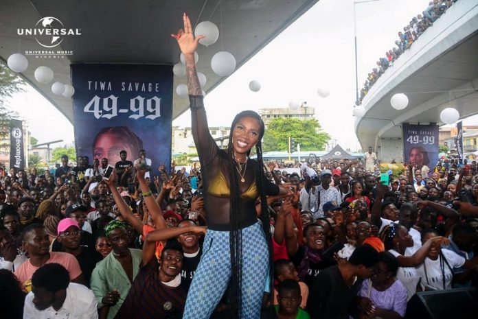 Ahead of her album release slated for 2020, pop diva, Tiwa Savage, on Tuesday promoted her latest single ’49-99′ under the popular Obalende bridge in Lagos.