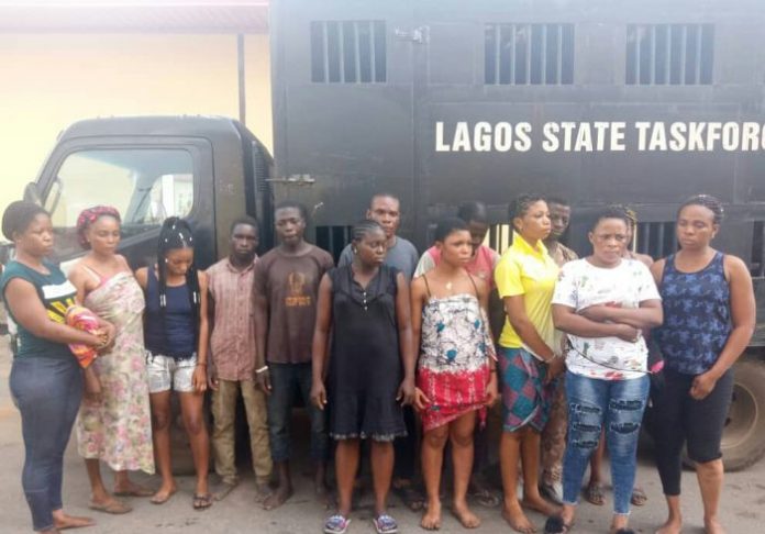 The Lagos Task Force arrested the 9 prostitutes and 5 miscreants during a raid at a brothel around Mile 2 area of the state, after complaints of crimes reportedly committed by the miscreant.