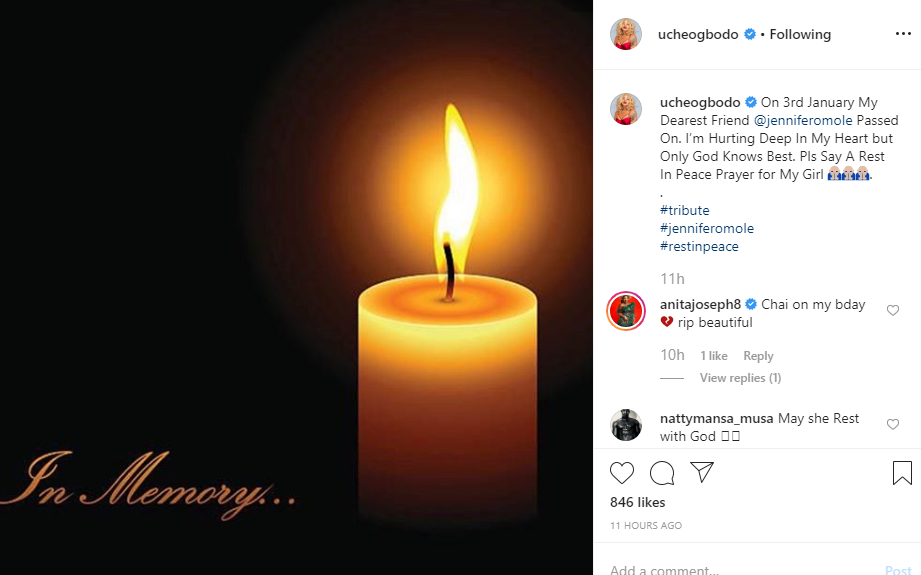 On 3rd January My Dearest Friend @jenniferomole Passed On. I’m Hurting Deep In My Heart but Only God Knows Best. Pls Say A Rest In Peace Prayer for My Girl