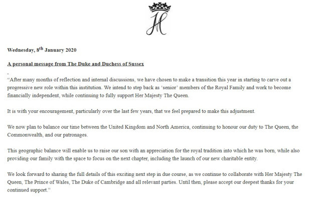 “We intend to step back as ‘senior’ members of the Royal Family and work to become financially independent, while continuing to fully support Her Majesty The Queen.