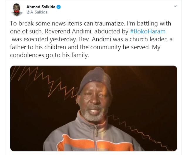 To break some news items can traumatize. I’m battling with one of such. Reverend Andimi, abducted by #BokoHaram was executed yesterday. Rev. Andimi was a church leader, a father to his children and the community he served. My condolences go to his family.