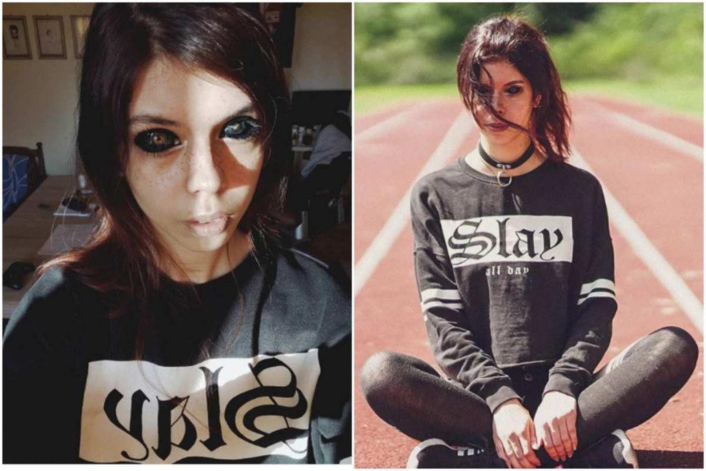 25-year-old Aleksandra Sadowska from the city of Wroclaw in the west of Poland reportedly went to the tattooist to dye her eyeballs black so that she can look like rap artist Popek, who also had his eyes dyed black.