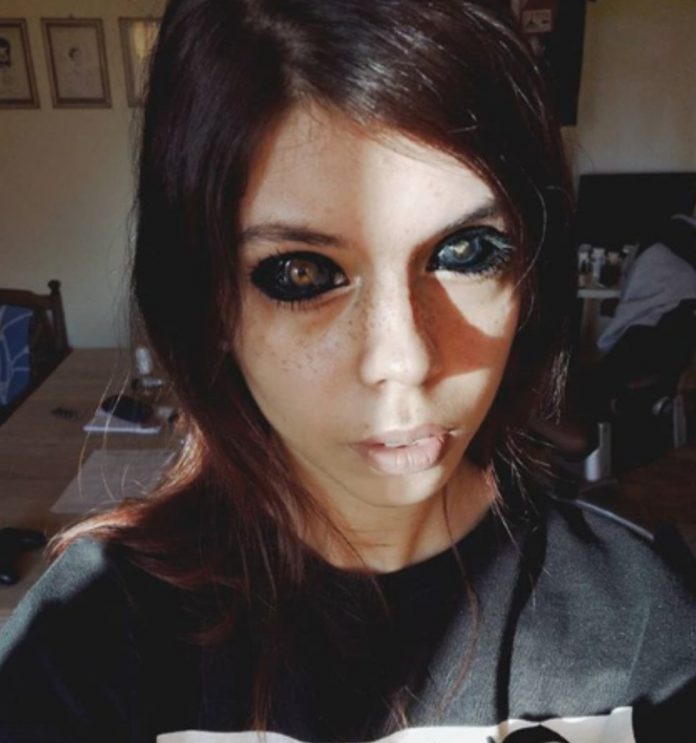25-year-old Aleksandra Sadowska from the city of Wroclaw in the west of Poland reportedly went to the tattooist to dye her eyeballs black so that she can look like rap artist Popek, who also had his eyes dyed black.