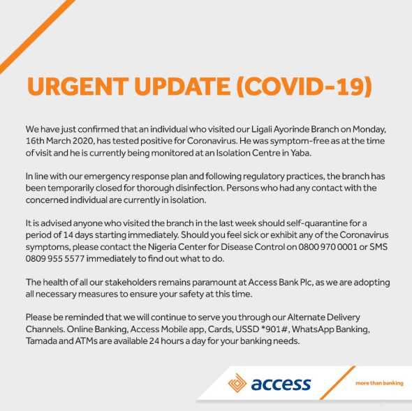 Access Bank has shut down its Ligali Ayorinde, Victoria Island branch after a customer tested positive to the deadly Coronavirus disease (COVID-19).