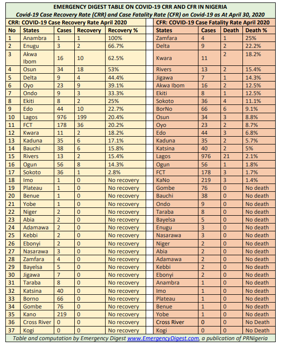 The Emergency Digest computed and analysed the CFR and CRR on the Covid-19 in Nigeria as at evening of April 30, 2020 based on the official data provided by the Nigeria Centre for Disease Control (NCDC).