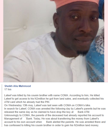 ”Lateef was killed by his cousin brother with name COMA. According to him, He killed Lateef to get access to his N2million he got from land sales, and eventually collected his ATM card which he already had the PIN.