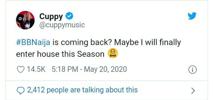 Cuppy in her Twitter post asked if the show is coming back for real and added that may be she would finally get to enter the house for the forthcoming season