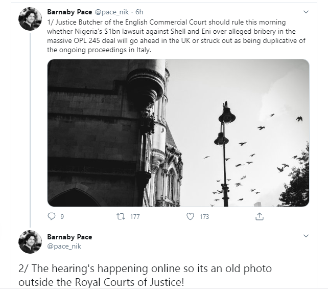 Justice Butcher of the English Commercial Court should rule this morning whether Nigeria’s $1bn lawsuit against Shell and Eni over alleged bribery in the massive OPL 245 deal will go ahead in the UK or struck out as being duplicative of the ongoing proceedings in Italy.