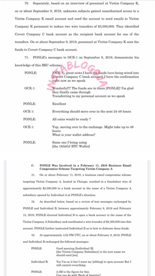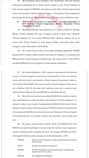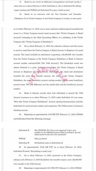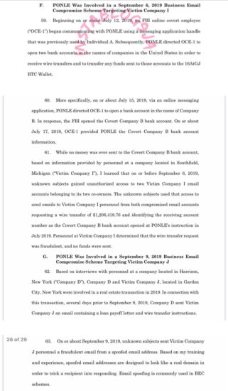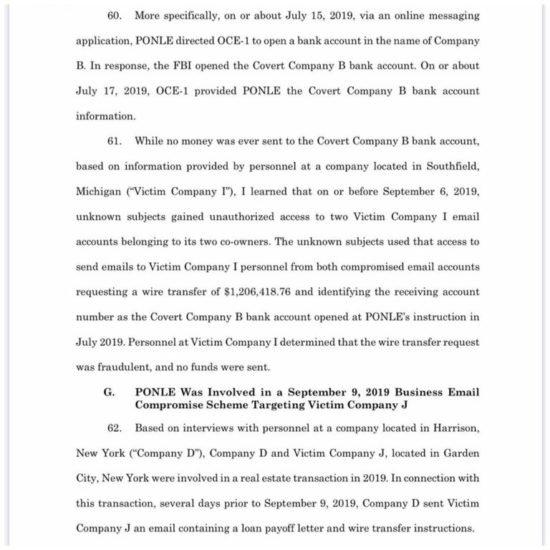 The emails were nearly identical to prior legitimate emails sent over the company’s email account, but the fraudulent emails instructed victims to wire funds to a bank account that was set up by money mules at the direction of Ponle, the complaint states.