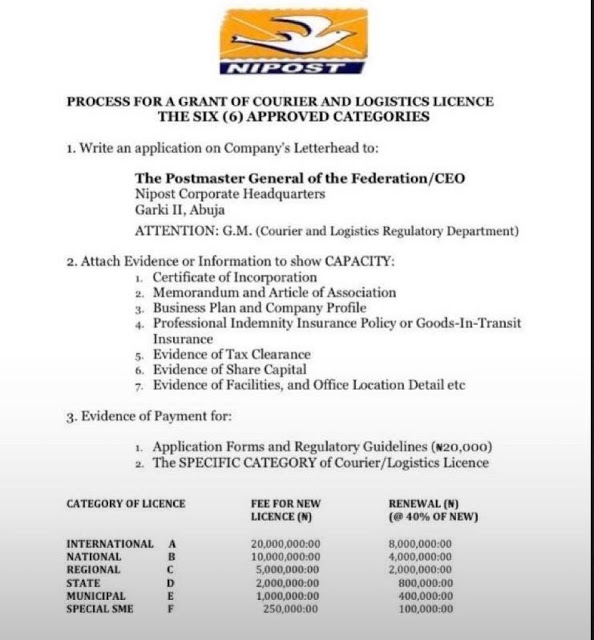 According to the new charges by NIPOST, companies which provide international courier services like DHL, UPS and FEDEX, are expected to pay N20m for a new licence and N8m annually while those offering national services are expected to pay N10m for licence and N4m yearly for renewal.
