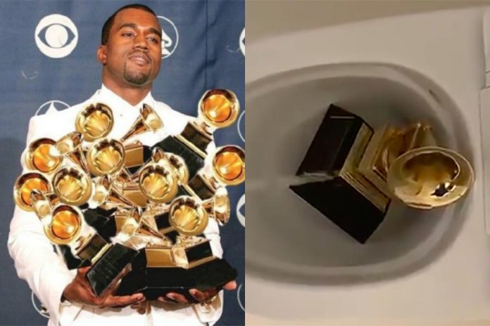 American rapper, Kanye West in a tirade, dropped one of his Grammy Awards in the toilet and pees on it.