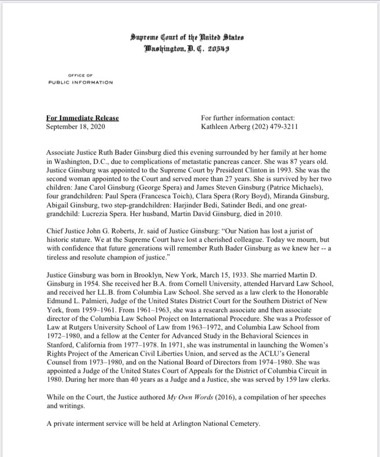 Ginsburg died of complications from metastatic pancreatic cancer, the court said in a statement.