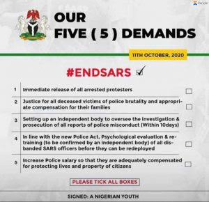 “The Forum collectively: welcomed the dissolution of the Special Anti-Robbery Squad (SARS) by the Inspector General of Police, Mohammed Adamu; Reaffirmed the constitutional rights of Nigerians to peaceful assembly and protest; Further affirmed the sanctity of life of every Nigerian and the role of the Police in protecting this right; Affirms that the five-point demands of the protesters and the ENDSARS movement are genuine concerns and will be addressed by the Government.’’
