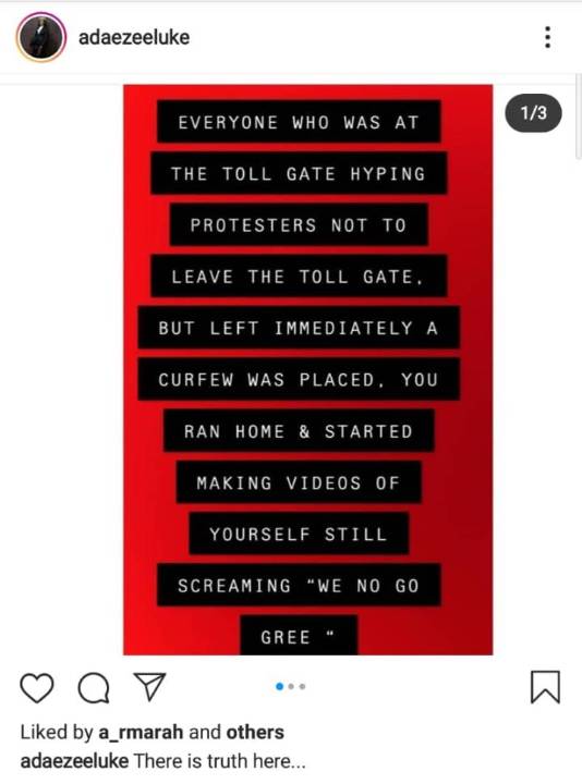 Taking to her Instagram page, she accused celebrities who were protesting at the Lekki toll gate of abandoning other protesters immediately after curfew was imposed in Lagos state.