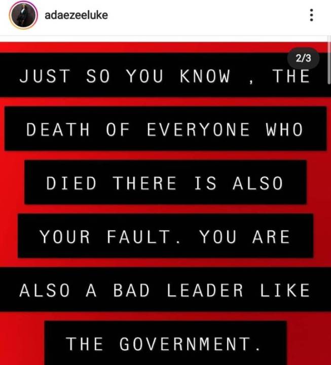 In reaction to the turn of events, Adaeze Eluke blamed her fellow celebrities over the deaths of #EndSARS protesters who were allegedly killed when gunshots were fired at the Lekki tollgate.
