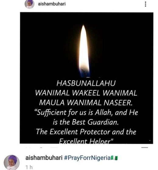 Mrs Buhari shared a photo of a burning candle alongside an Islamic quote with the hashtag #PrayforrNigeria.