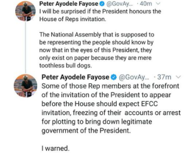 Reacting via his tweets, Fayose said the lawmakers demanding the citation should expect EFCC invitation, freezing of their accounts, or arrest.
