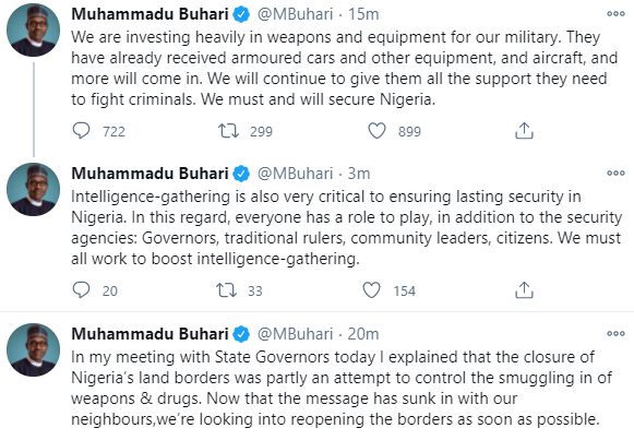In my meeting with State Governors today I explained that the closure of Nigeria’s land borders was partly an attempt to control the smuggling in of weapons & drugs. Now that the message has sunk in with our neighbours,we’re looking into reopening the borders as soon as possible.”he said
