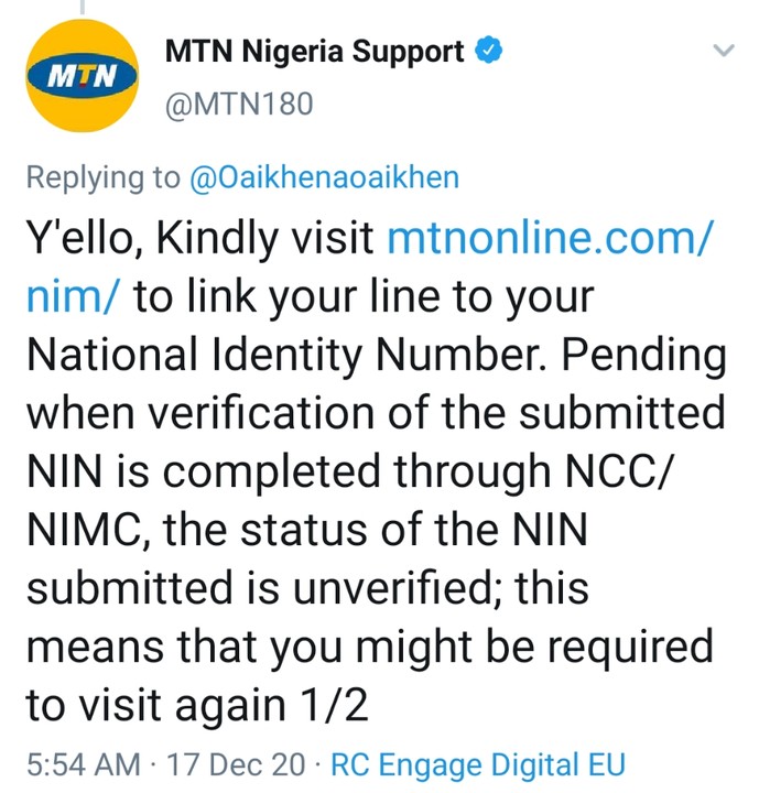 Y’ello, Kindly visit https://mtnonline.com/nin/ to link your line to your National Identity Number. Pending when verification of the submitted NIN is completed through NCC/NIMC, the status of the NIN submitted is unverified; this means that you might be required to visit again