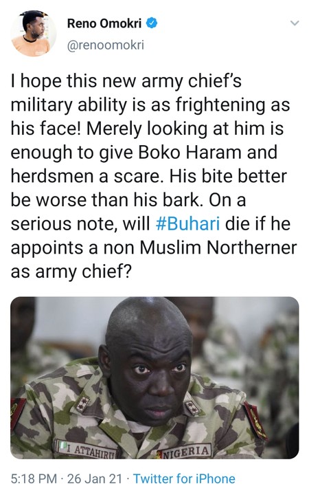 I hope this new army chief’s military ability is as frightening as his face! Merely looking at him is enough to give Boko Haram and herdsmen a scare. His bite better is worse than his bark. On a serious note, will #Buhari die if he appoints a non-Muslim Northerner as army chief?