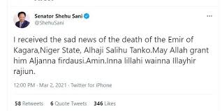 He said, “I received the sad news of the death of the Emir of Kagara, Niger State, Alhaji Salihu Tanko. May Allah grant him Aljanna firdausi. Amin. Inna lillahi wainna Illayhir rajiun.”