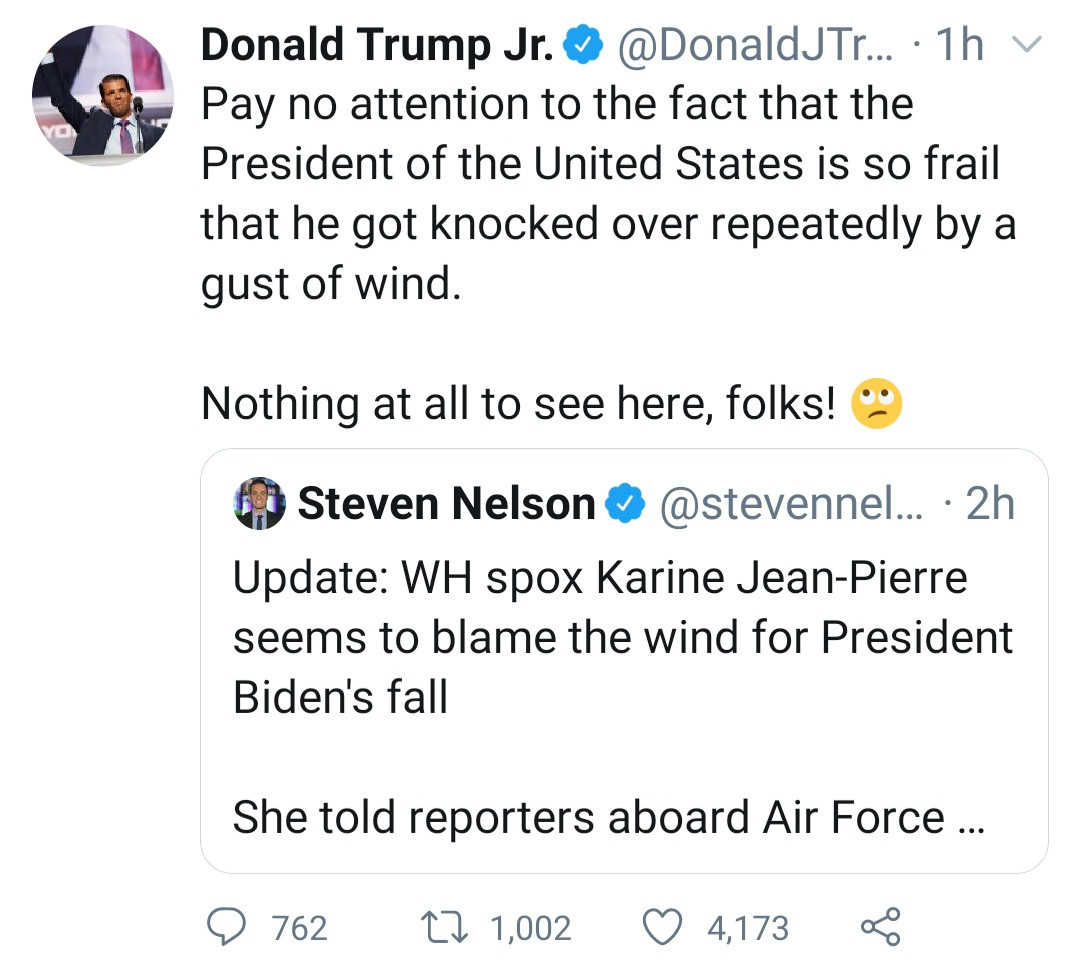 In another post, he wrote: “Pay no attention to the fact that the President of the United States is so frail that he got knocked over repeatedly by a gust of wind.