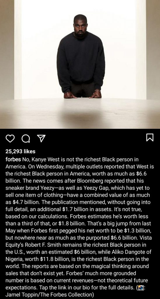 Forbes further stated that “reports that the celebrity is worth nearly $7 billion are based on the magical thinking around sales that don’t yet exist. This is why he’s currently worth less than one-third of that.”