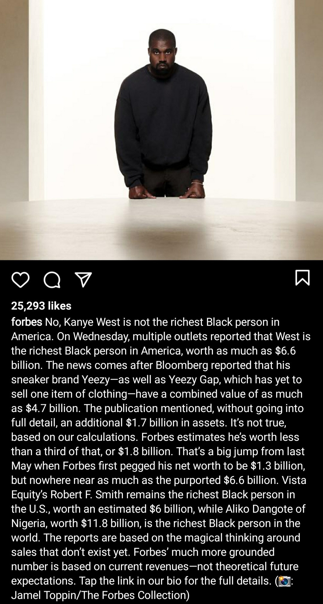 Forbes has denied reports that Kanye West is now the richest black man in America’s history after his businesses were valued at $6.6 billion.
