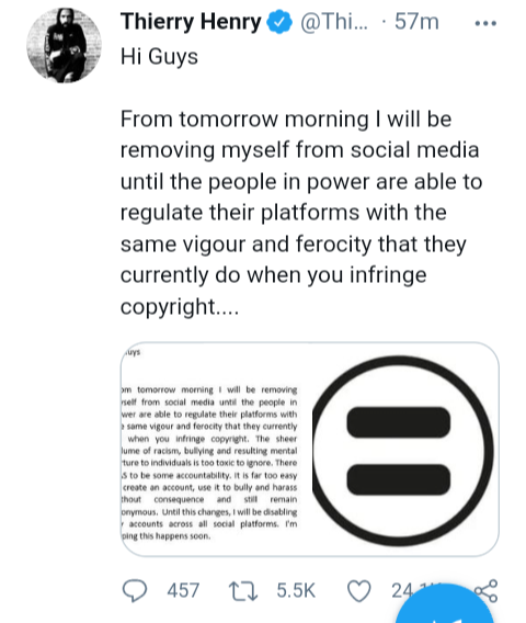 Former Arsenal and France striker Thierry Henry says he is removing himself from social media because of racism and bullying across platforms.