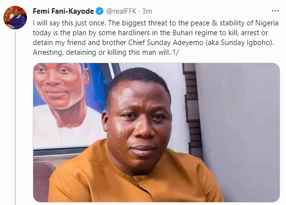 Former Aviation Minister, Femi Fani-Kayode, has said that the biggest threat to the peace and stability of Nigeria is the “plan by some hardliners in the Federal government to kill or arrest” Yoruba activist, Sunday Igboho.