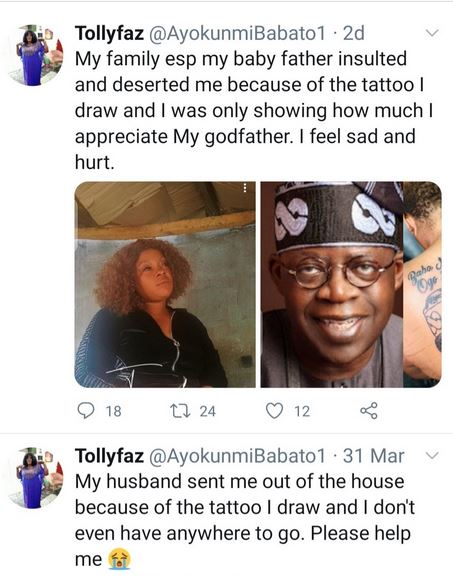 The Nigerian woman who drew a tattoo of Bola Tinubu, the National leader of the All Progressive Congress, APC took to social media to seek help while revealing she has been insulted and sent out of her home by her husband.