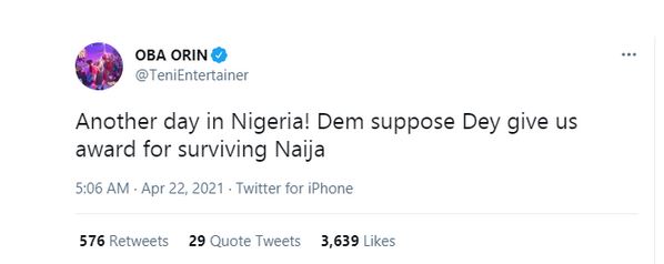 Nigerian singer, Teniola Apata took to Twitter to say that those in Nigeria should be given an award for surviving the country.