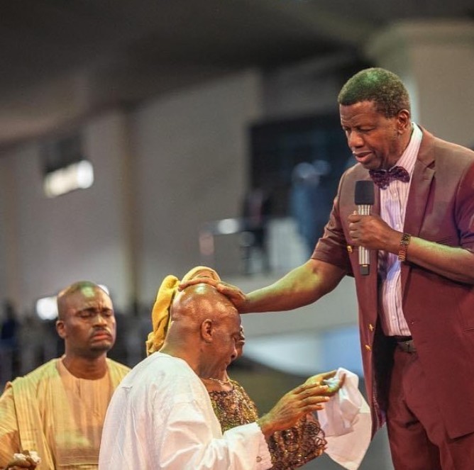 The duo knelt as Adeboye blessed them to celebrate their 40th wedding anniversary.